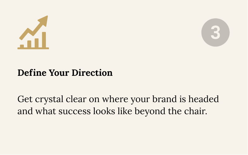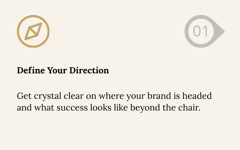 You'll define your brand direction, signature lane, and what success looks like beyond the chair. This foundation sets the tone for every income stream and system you'll build next.