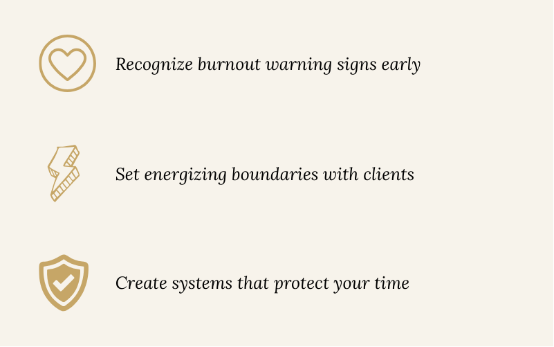 Identify the patterns that lead to overwork, undercharging, and inconsistent income. This bonus module helps you build sustainable success that doesn't sacrifice your wellbeing.